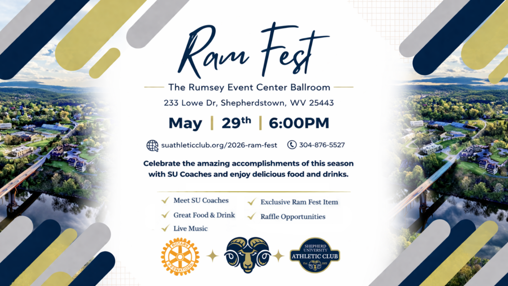 Ram Nation, mark your calendars for the 2026 Ram Fest! Join us Friday, May 29 at 6 PM at the Rumsey Event Center Ballroom in Shepherdstown, WV as we cap off another outstanding year of Shepherd Athletics.